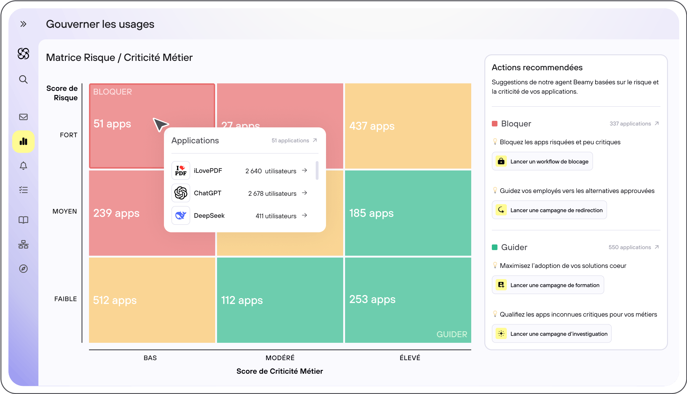 - Exploitez la matrice de décision Beamy : croisez criticité métier et niveau de risque pour positionner chaque application