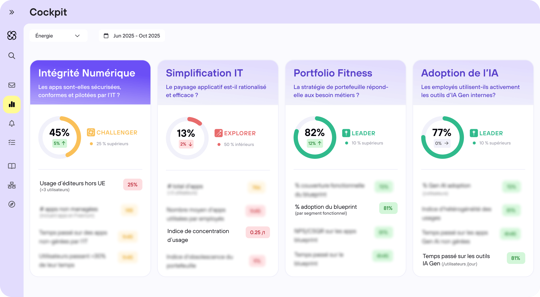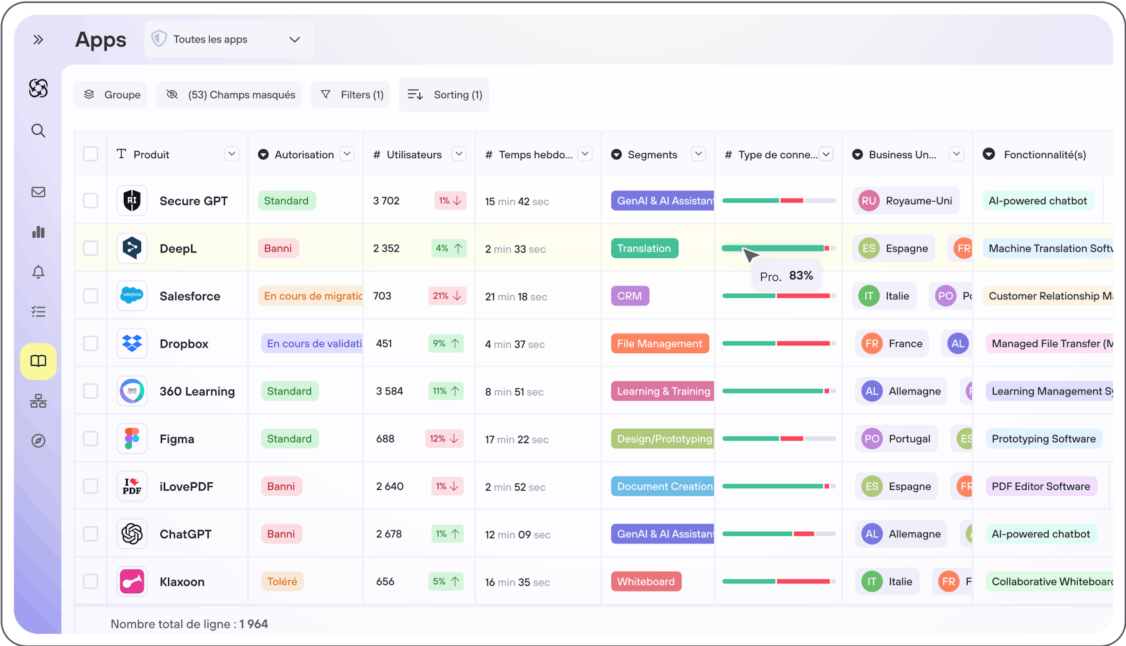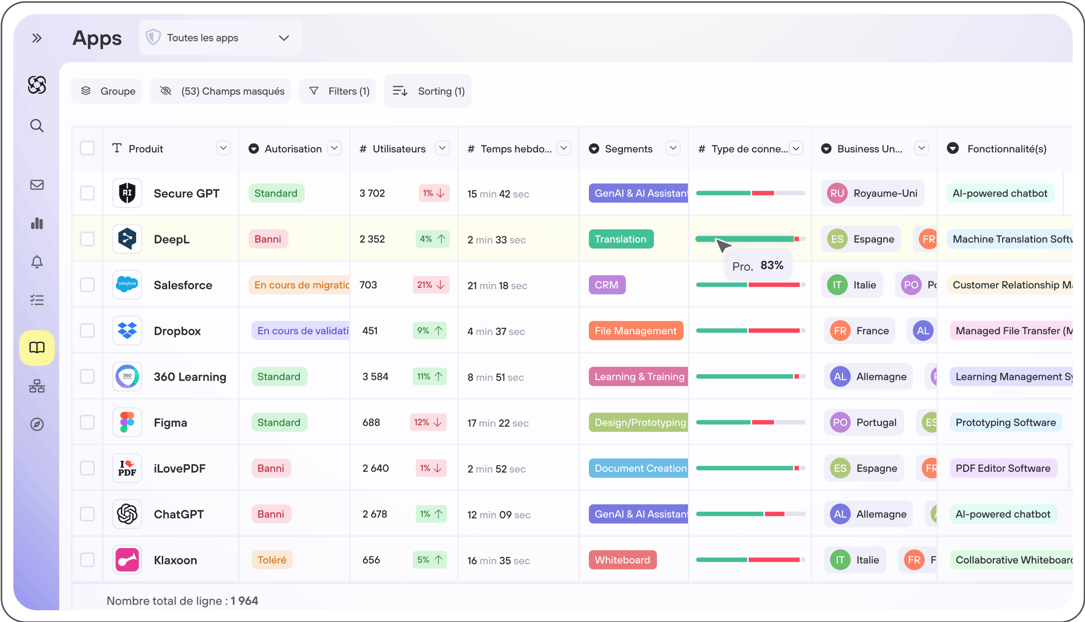 - Détectez et référencez automatiquement 100 % des applications (SaaS publics, apps internes)