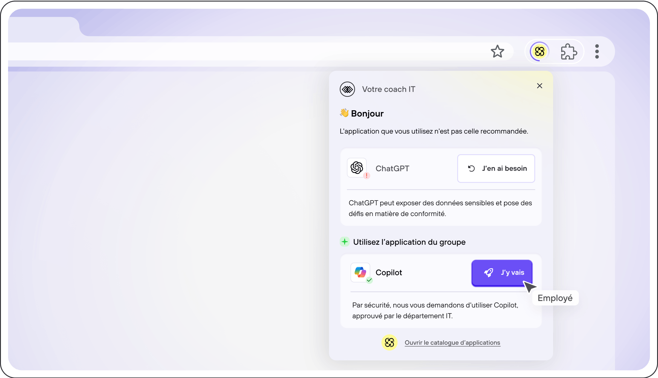 - Lancez des campagnes de redirection et d’information contextuelles pour accompagner les collaborateurs et garantir l’adhésion