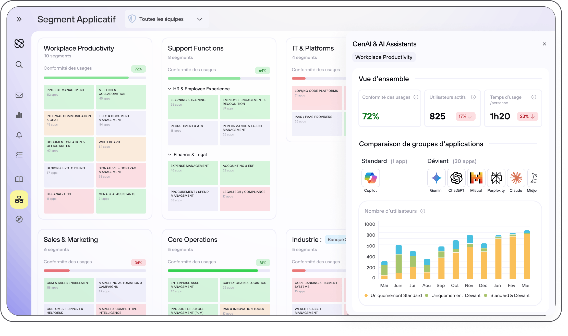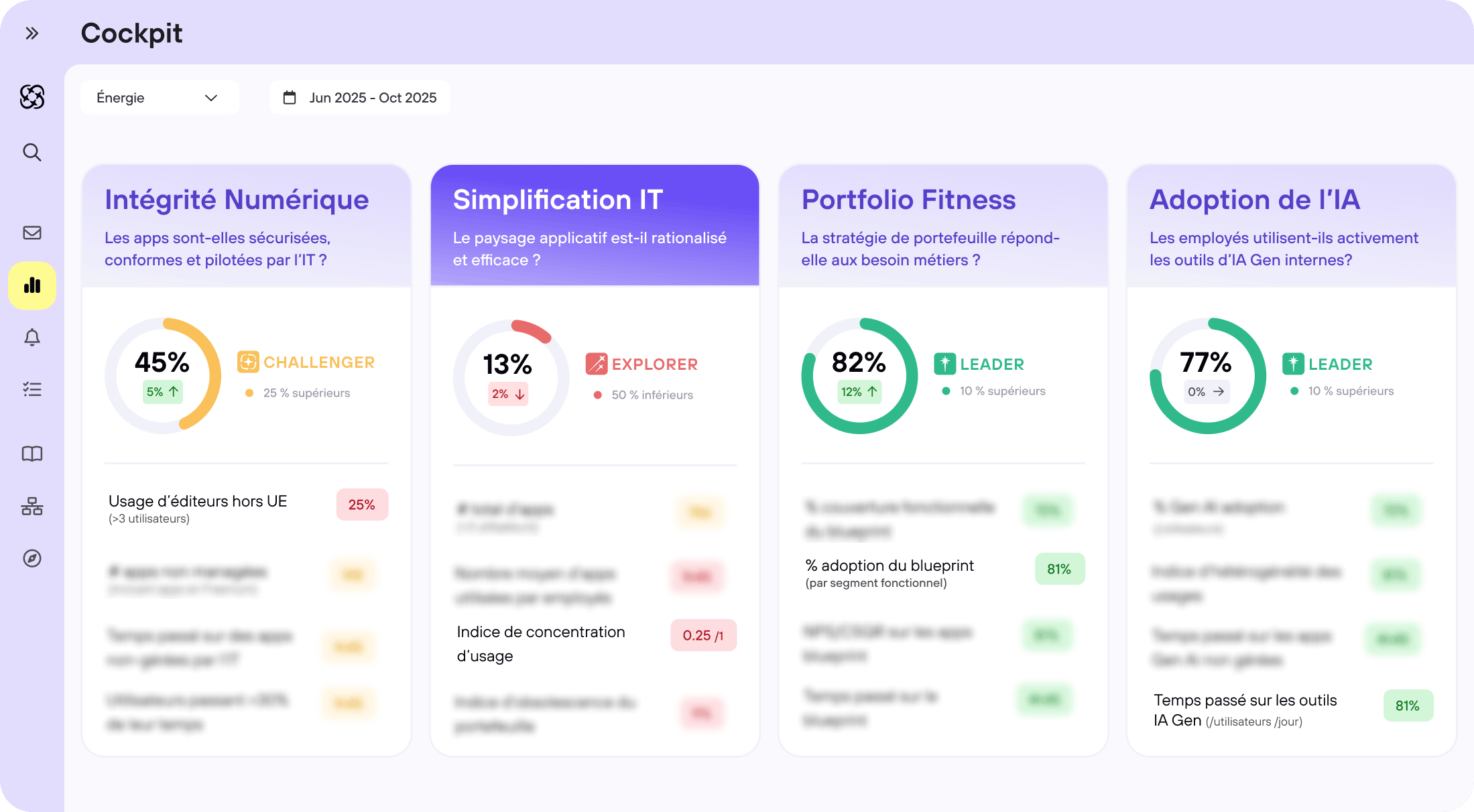 Cartographiez, segmentez et optimisez vos usages applicatifs pour réduire les coûts, accélérer les décommissionnements et maximiser l’adoption.